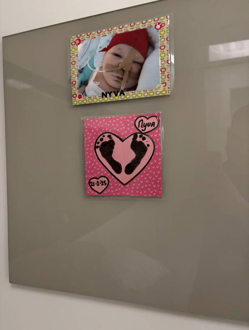 De rolstoel mocht niet mee de afdeling op, dus ik strompelde langzaam naar haar kamer. Vin haalde een stoel voor me. R. bleef naast Nyva staan, ook toen ik vroeg of ik dichterbij mocht komen. Dat voelde moeilijk, maar ik slikte het maar weg. De verpleging had iets liefs gedaan: ze hadden met Nyva geknutseld, afdrukjes gemaakt van haar voetjes en een foto op een kartonnetje met een mooi printje geplakt. Zoveel aandacht in iets kleins. Even leek het alsof het gewoon was, een baby die bij de opvang iets maakte voor haar ouders. Toen R. vertrok, mocht ik haar weer vasthouden. Vin durfde nog niet, hij vond het goed dat ik haar bij me hield. En stiekem was ik daar blij om. Ze lag weer fijn op het kussen bij me en ik voelde me rustig. Ik wilde niet dat het moment ophield, stelde het kolven uit tot ik het echt niet langer kon.
