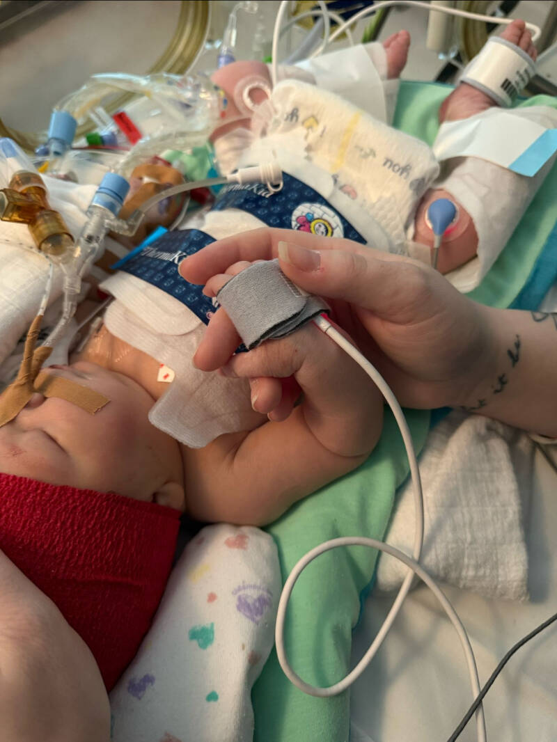 Die middag mocht ik haar voor het eerst vasthouden. Daar had ik zó lang op gewacht. We riepen de verpleging om te helpen met al die slangetjes, draadjes en plakkers. Ik mocht haar ook niet zelf oppakken. Er waren drie mensen nodig om haar op mijn schoot te leggen. Ik hield een kussen vast zodat ze goed lag, mijn hart bonsde in mijn keel en ik kneep het kussen fijn. Maar toen ze daar eindelijk lag, eindelijk bij mij, werd het stil. Niet huid op huid, maar toch dichtbij genoeg om haar te voelen. Ik durfde bijna niet te ademen. Mijn handen volgden haar gezichtje en kinnetje, haar vingertjes, haar teentjes, haar zachte neusje. Ik streek over haar wang en voelde hoe de tranen kwamen, van geluk, en een beetje verdriet omdat het zo moest. Even voelde ik me volledig moeder. Alles klopte, hoe kapot ook…