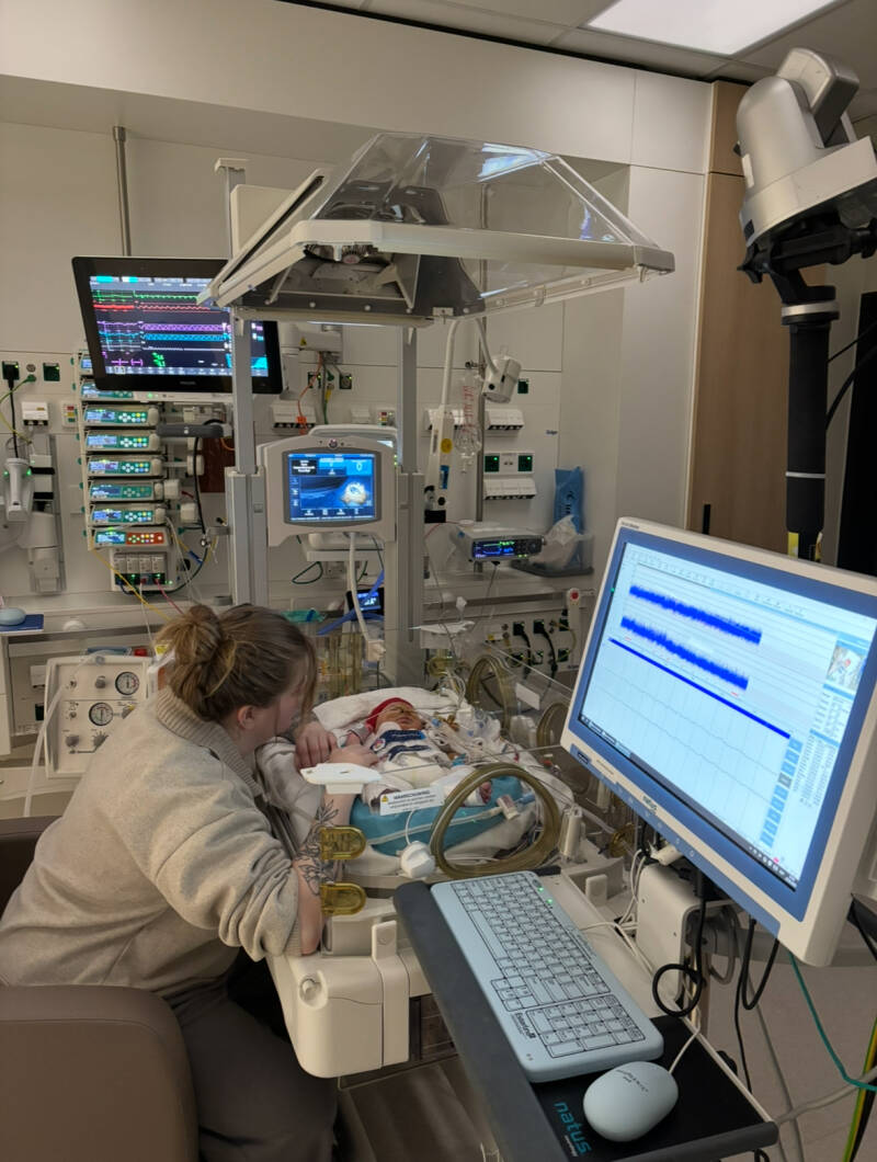 De verpleegkundige vroeg meteen of ik Nyva weer wilde vasthouden. Natuurlijk wilde ik dat. Ze lag heerlijk in mijn armen, ik wreef over haar kleine handjes. Ik voelde haar zachte wangetjes en gaf haar overal kusjes. Ze rook naar iets dat alleen van haar was, een soort eigen geurtje. Toen we haar teruglegden, zei de verpleging dat ze een prachtig kleurtje had gekregen. “Vitamine L,” lachten ze. “Vitamine love.” We lachten mee. Ze was echt roze, warm, vol leven.