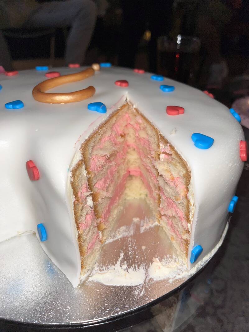 Ik telde de dagen af tot we wisten wie er in mijn buik groeide: ons zoontje of ons dochtertje. Met mijn collega Dionne had ik afgesproken dat zij de taart voor de gender reveal zou maken. Naast haar werk bij De Berenstad bakt ze de heerlijkste taarten op bestelling. Ik schreef een kaartje voor haar, waarin de echoscopiste het geslacht van onze baby noteerde. Dionne ging meteen aan de slag: het werd een simpele, hartvormige taart, gevuld met gekleurde botercrème. Precies wat wij wilden. Geen groot feest, maar intiem - alleen wij, onze ouders, familie en een lekkere taart.